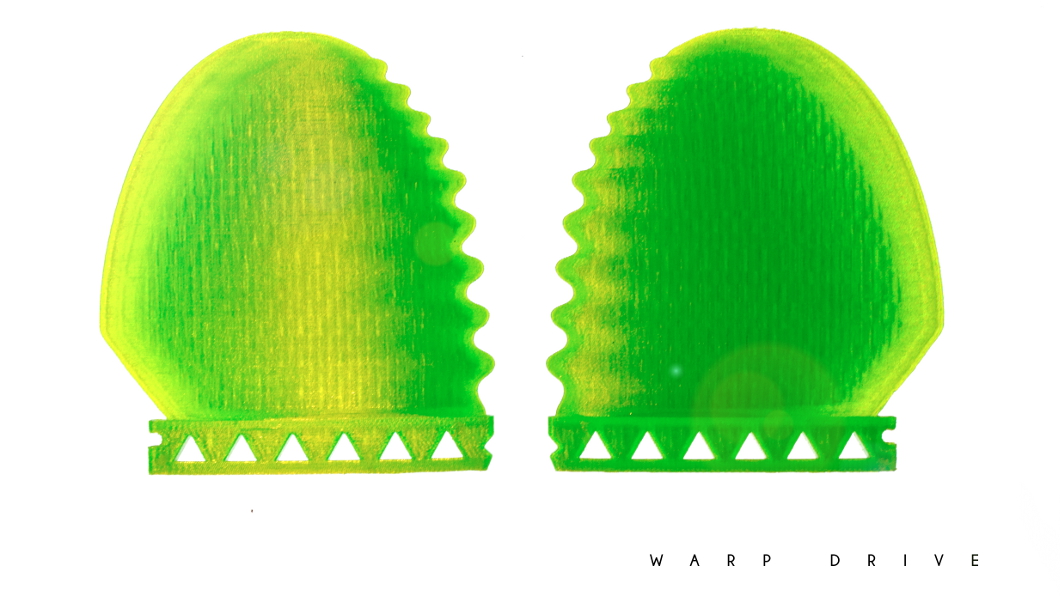 Are there performance differences between warp drive and a standard fin or does this just represent a faster/cheaper/easier construction? The shape of Warp Drive fins is not determined by the printing process, it is driven solely by performance considerations. 3d printing allows these to be pursued without limitation. Standard fin design is determined by habit, hidebound tradition and construction constraints, these issues are papered over via the employment by the surfing industry of highly athletic surfers and through the monopolized marketing grip which the cartel has over the surfing consciousness. So the short answer is ‘yes’, Warp Drive fins do have performance differences and advantages over the mass market designs, these are permitted by the 3d printing revolution but not determined by it.