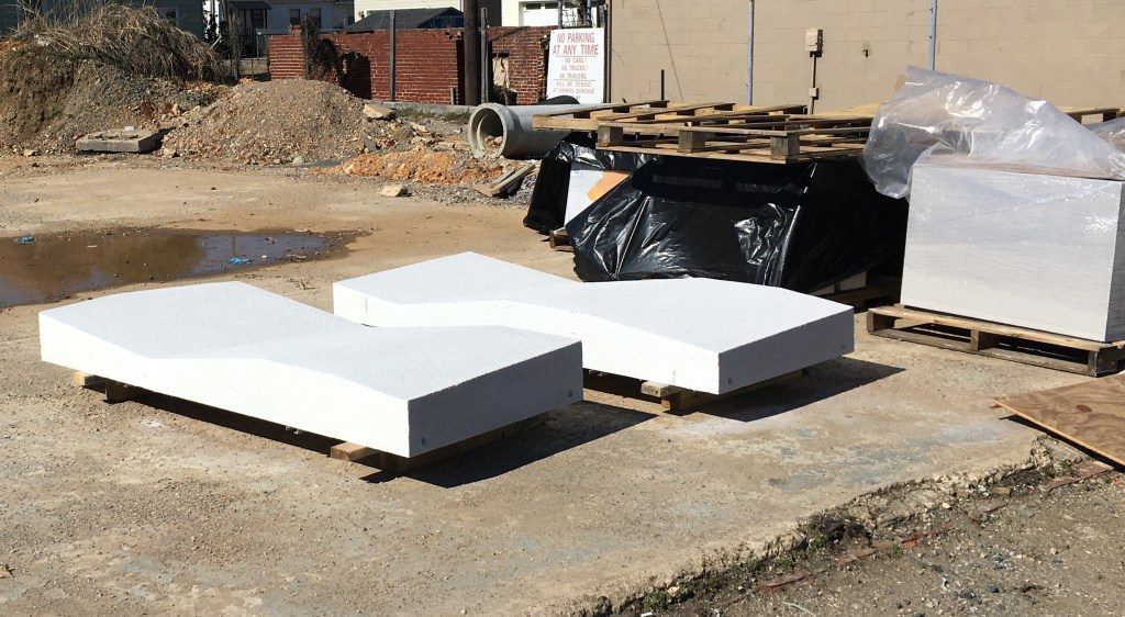 The branch is located just a few blocks from I-24 and the famous Chattanooga Choo Choo in a neighborhood you wouldn’t expect to house a groundbreaking building. On Sunday, February 21, 2021 the building was very much still under construction, but it was easy to pull into a neighboring parking lot for a good look. The façade is made from a series of prefabricated panels hung on the building with the “wave” design. Each individual panel appears simple (like the ones on the ground below), but they come together for a total effect greater than the sum of its parts.